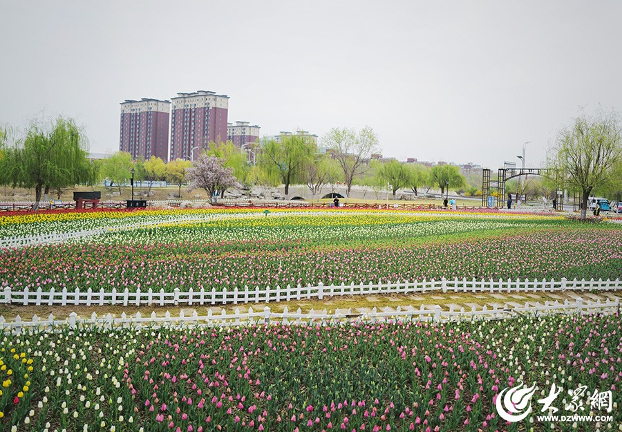 秦皇河郁金香花田全景,各色花株错落铺展,城市楼宇作背景(摄影:李鹏)