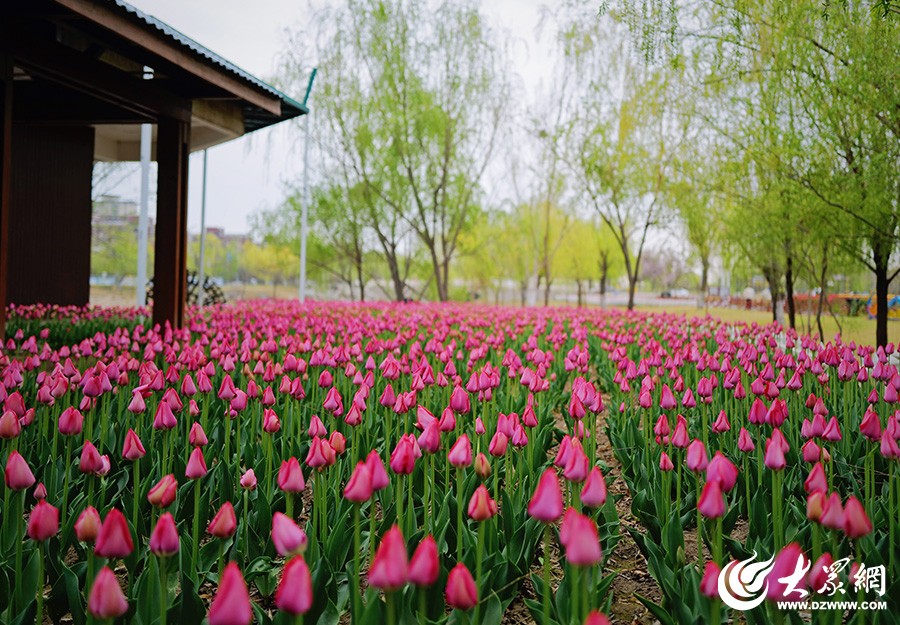 粉紫色郁金香花田与亭台相映,尽显春日雅致(摄影:李鹏)